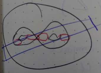 In the picture, the black circle is the ambient projective space, the black torusy thing is the variety X, the blue rectangle is the hyperplane, and the red bits are the intersection Y.