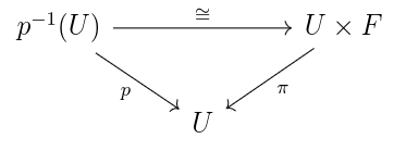 Locally products: A fibre bundle consists of a total space E, a base space B, a fibre F, and a map , such that for any point x in the base B, there is a neighborhood U of x and a homeomorphism such that the following diagram commutes