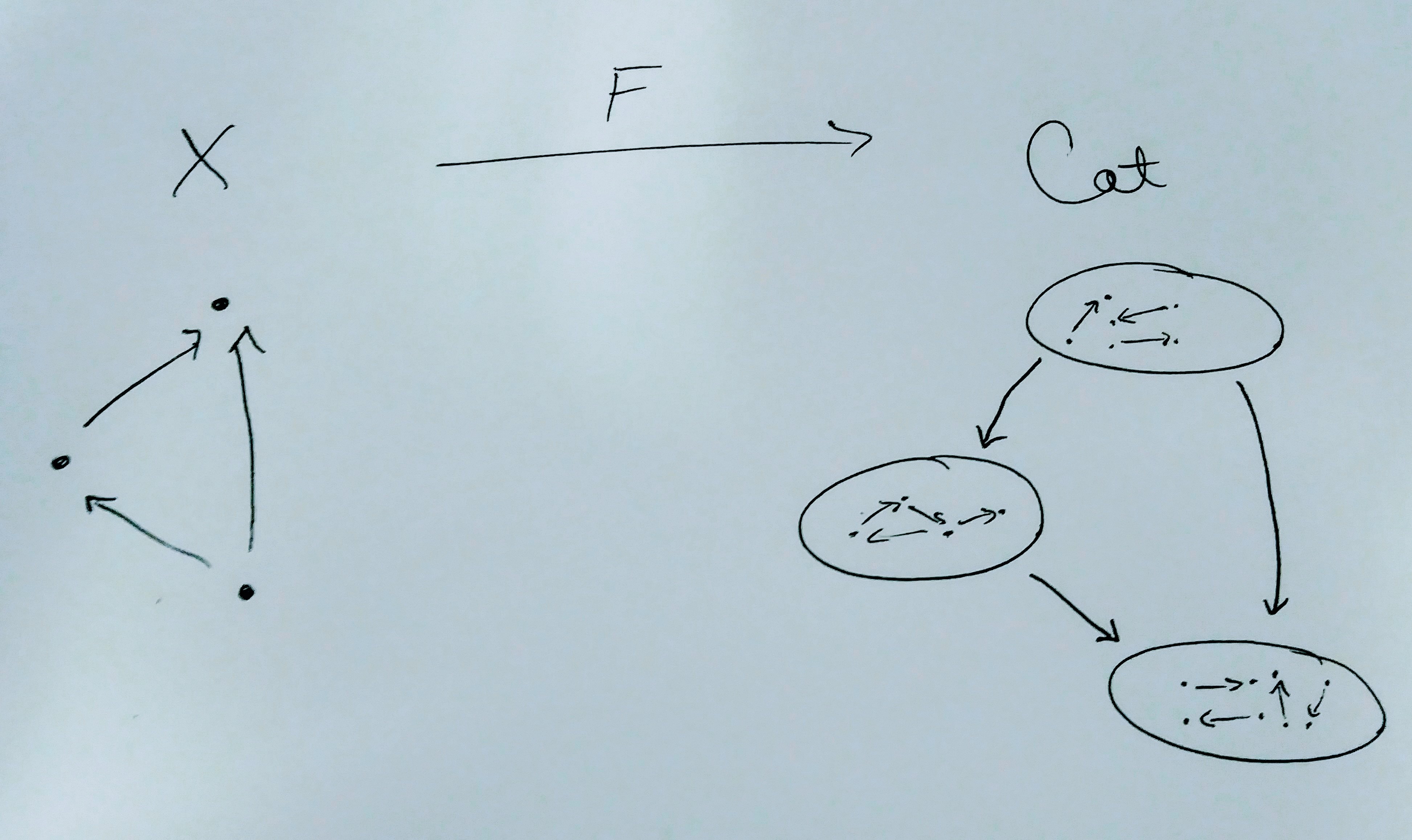 The naivete of this attempt is that we should bump categories in the multisets stuff to 2-categories. In multisets, X was a set, and we bumped it up to a category really just because the collection of sets naturally wants to be a category. We could have just as well have said that a multiset was a function , if you don’t mind that one of those isn’t a set. In the same way, the collection of categories naturally wants to be a 2-category, so we should bump the category X up to a 2-category and consider the corresponding type of thing that can go
