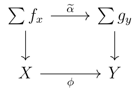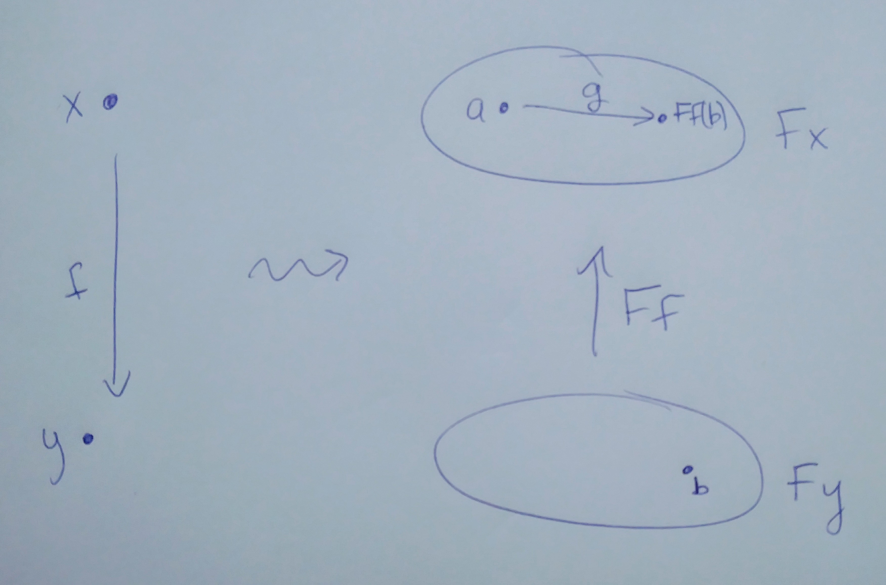 where you send an object (x,a) to x, and a morphism (f,g) to f. In fact, this functor has a nice lifting property which makes it a fibration of categories, and we say that is fibred over X. I won’t get into exactly what this lifting property is, but its precisely what is needed to take all the arrows that cross the dotted lines in the picture above, and turn them into a functor between those two subcategories.