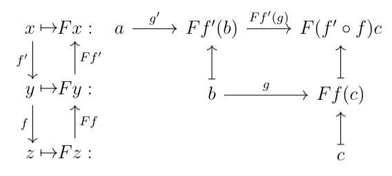 The formula for composition would look a little more complicated if we were doing it for pseudofunctors instead of functors, but the idea is the same. The formula might seem a little goofy, but actually it’s completely natural! I always remember it by drawing out this picture for morphisms and