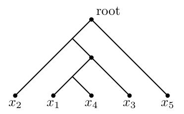 Example: Let be the species defined as follows: for a finite set X, B(X) is the set of binary, planar, rooted trees whose leaves are equipped with a bijection to X, or X-labelled trees for short. For X=5, B(5) has an element like this: