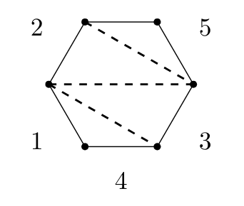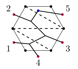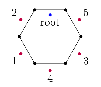 Rather than labelling sides, we’re going to label vertices that we place just outside of each side of the polygon (except for one that we place inside). So we draw vertices, label the top-most one `root’, and the others in the same order as the leaves of our element of